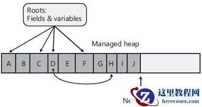 压缩之后,“指向这些对象的指针”的变量和CPU寄存器现在都会失效,垃圾回收器必须重新访问所有根,并修改它们来指向对象的新内存位置。这会造成显著的性能损失。这个损失也是托管堆的主要缺点。