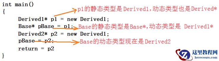 1 class Derived1:public Base 2 {}; 3 class Derived2:public Base 4 {}: 5 int main() 6 { 7 Derived1* p1 = new Derived1; 8 Base = p1; 9 Derived2* p2 = new Derived1;10 Base = p2;11 return = p212 }