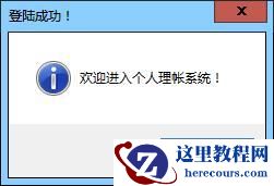 MessageBox.Show("欢迎进入个人理帐系统!", "登陆成功!", MessageBoxButtons.OK, MessageBoxIcon.Information);