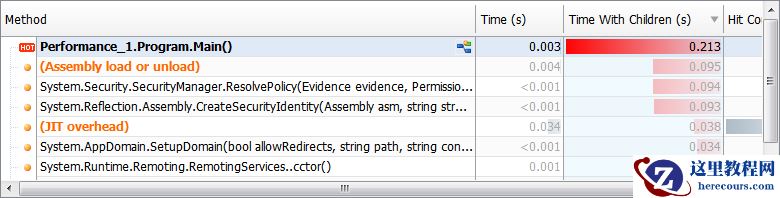 选定后可以立即在下面的结果窗口中看到最耗时的方法,比如上面的DEMO,当然性能都消耗在了Main函数上。