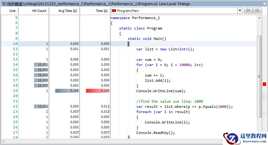 左侧可以看到行号,此段代码执行的次数(Hit Count),平均执行时间,总的执行时间,当然还可以同时看到代码供分析使用。