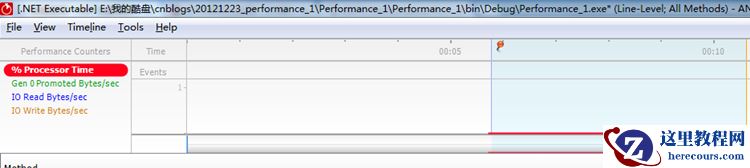 点击“Start Profiling”后启动之前编译的程序,软件开始执行,如果是其他交互程序如winform、web等,操作完需要进行性能调优的功能后,在顶部的运行时间轴里用鼠标选定需要查看的时间段即可,一般有性能问题的时间段会出现一个波峰,选定那个时间段即可。