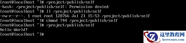 修改可执行权限后,即可成功运行“Hello World”,这就是我们“Self-contained applications”方式的部署方法