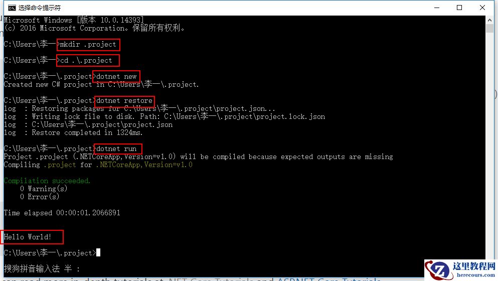 打开cmd,依次输入mkdir .project(创建目录),cd .\.project(进入目录),dotnet new(新建初始项目),dotnet restore(还原依赖),dotnet run(运行)即可运行第一个Hello World程序