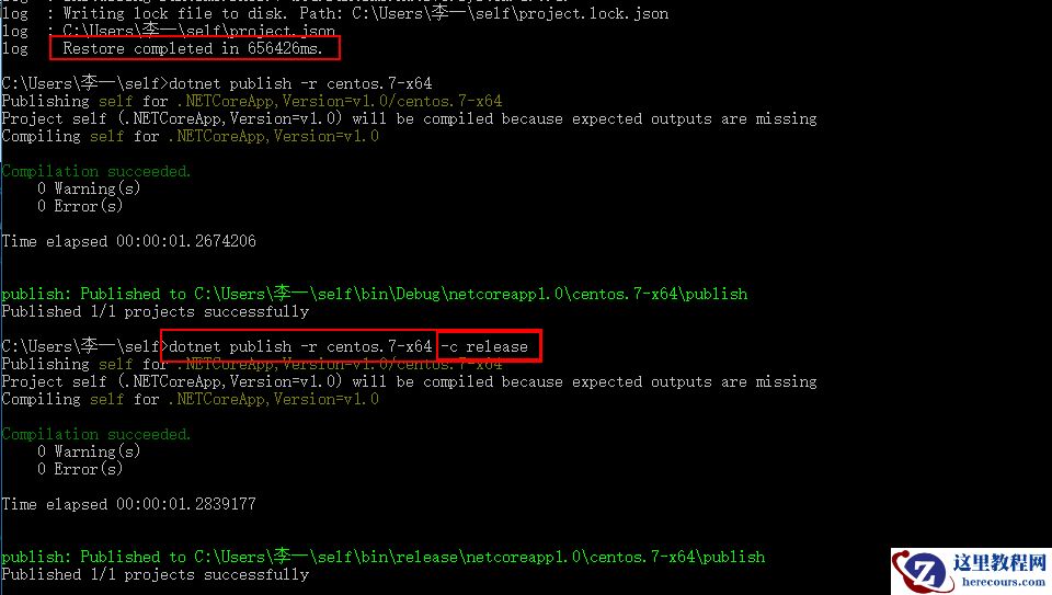 之后执行dotnet restore指令,针对平台进行还原操作。该步操作耗时较久,虽然只是两个平台,第一次也花了较长时间。紧接着进行进行dotnet publish -r centos.7-x64 -c release。