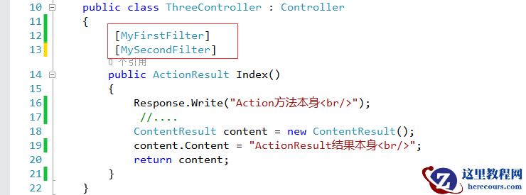 (1)、相同类型过滤器应用示例:两个自定义Action过滤器MyFirstFilter,MyThreeFilter应用到同一个Action方法Index上。