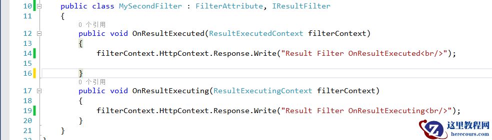 结果过滤器是多用途的过滤器,他会对动作方法所产生结果进行操作,结果过滤器实现IResultFilter接口,创建自定义结果过滤器需要现IResultFilter接口,该接口代码如下所示: