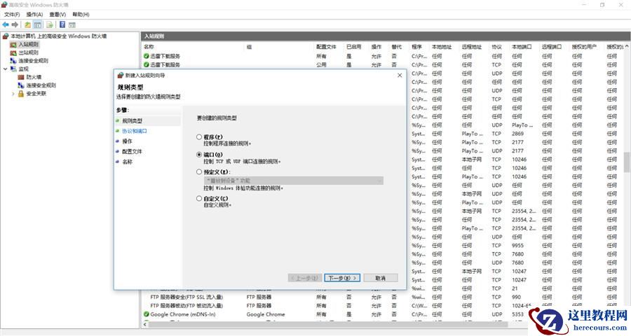 的窗口依次选择:选中端口—>下一步—>选中TCP以及特定本地端口填入要开放的端口号(这里填入80;当让也可以选择开放所有端口