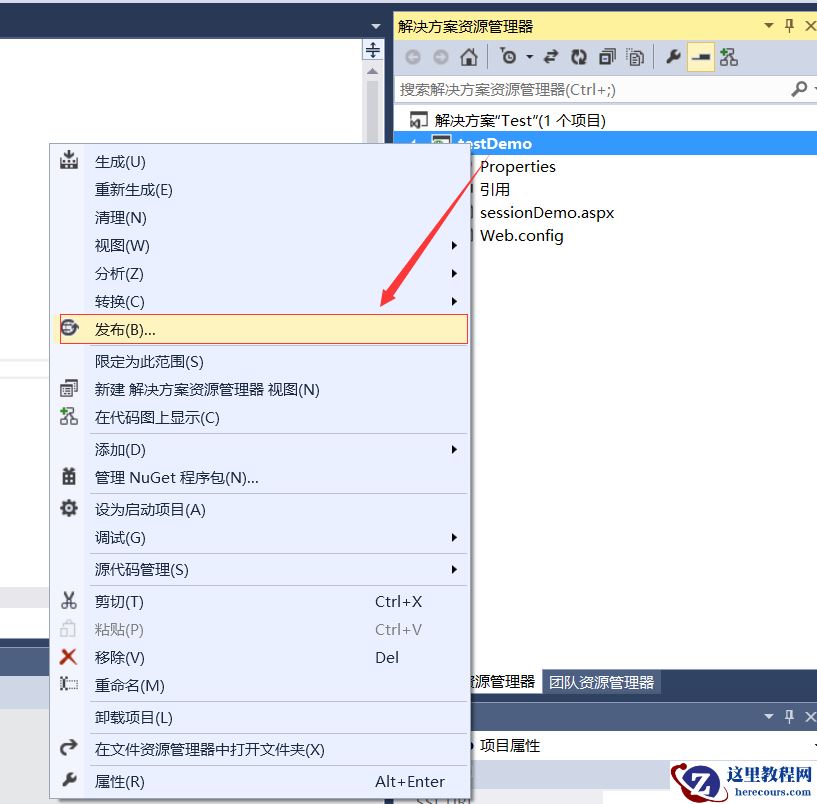 4、待第3步“重新生成解决方案”结束后,选择web运用程序,如下图中“testDemo”—>点击鼠标“右键”—>在弹出对话框中,选择“发布”。