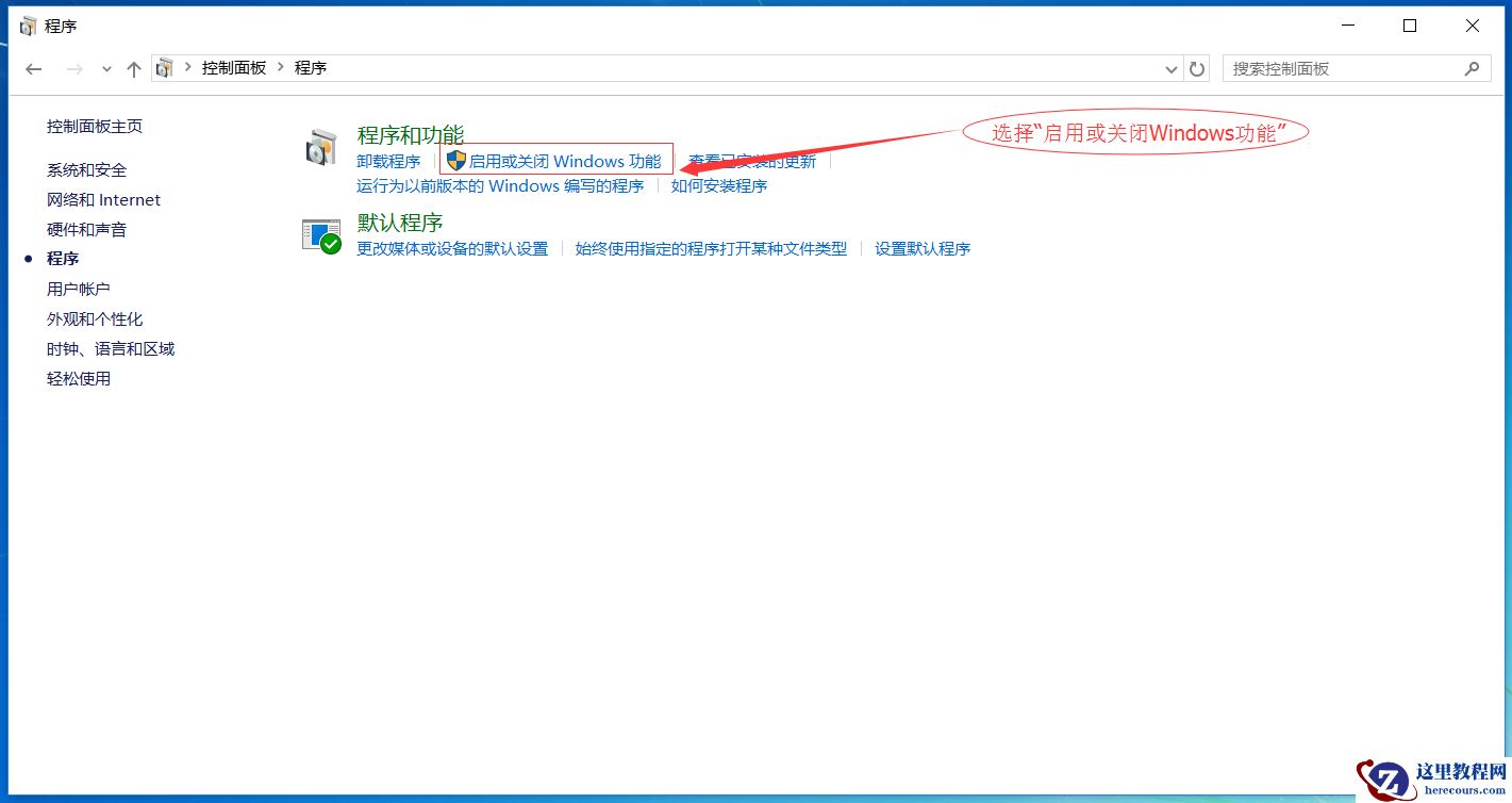 2、在弹出对话框中选择“启用或关闭Windows功能”。