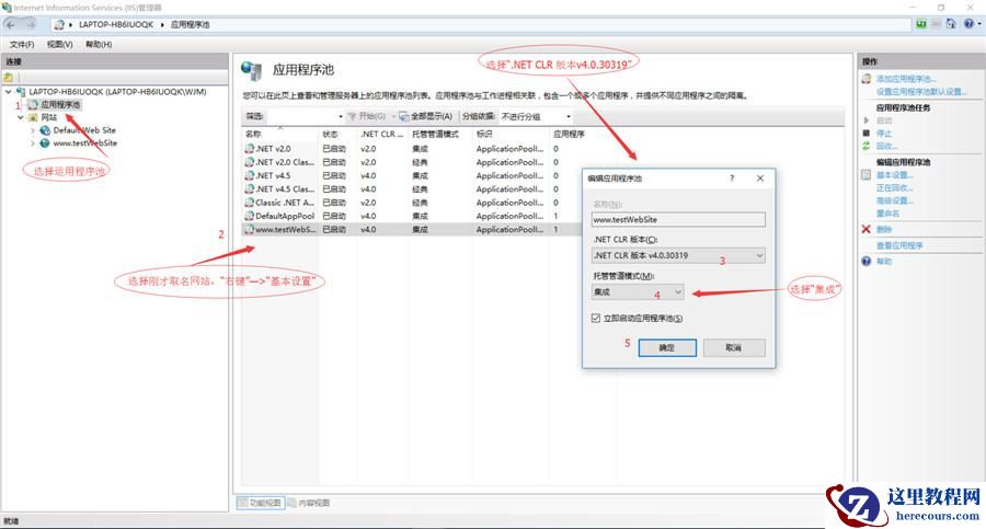 6、运用程序池,应选择与网站名称相同,选择集成方式(当都发布不成功时,可以经典与继承来回切换测试),选择版本V4。