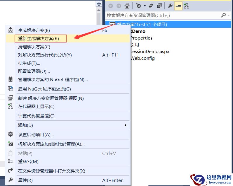 3、待第2步“清理解决方案”结束后,选中“解决方案”—>点击鼠标“右键”—>在弹出对话框中,选择“重新生成解决方案”。