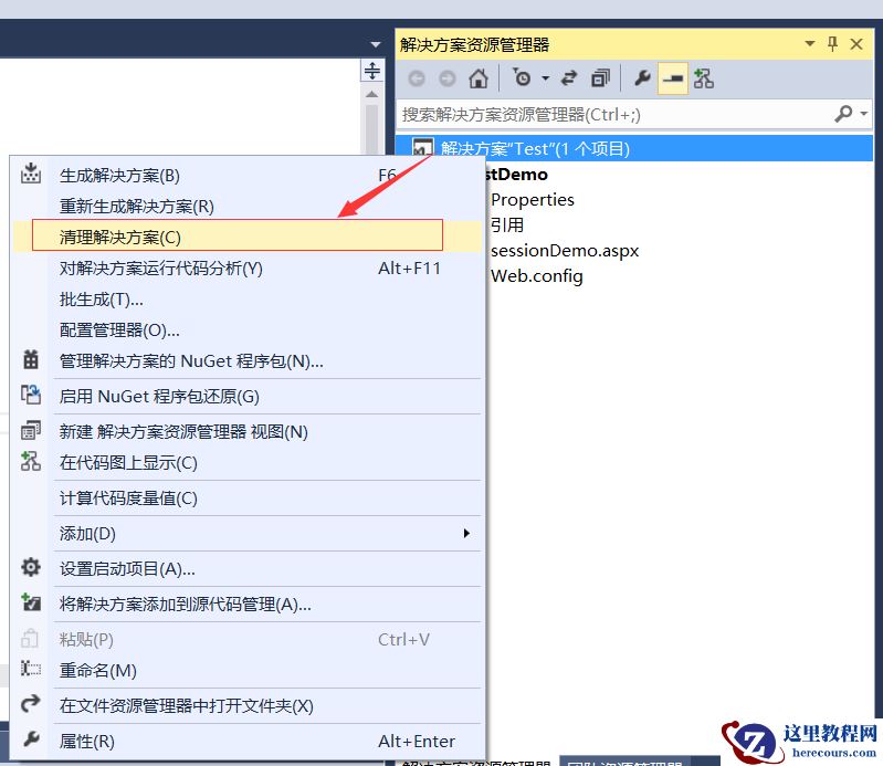 2、选中解决方案,点击鼠标“右键”—>从弹出对话框中,选择“清理解决方案”。