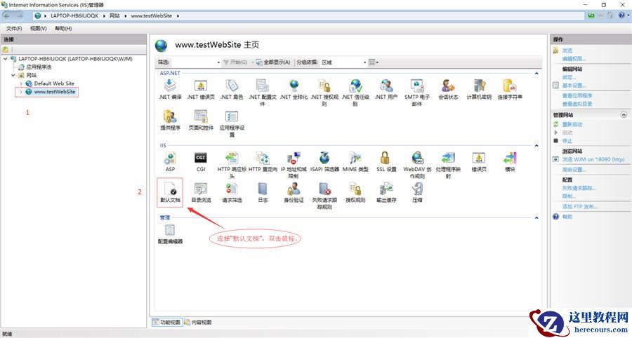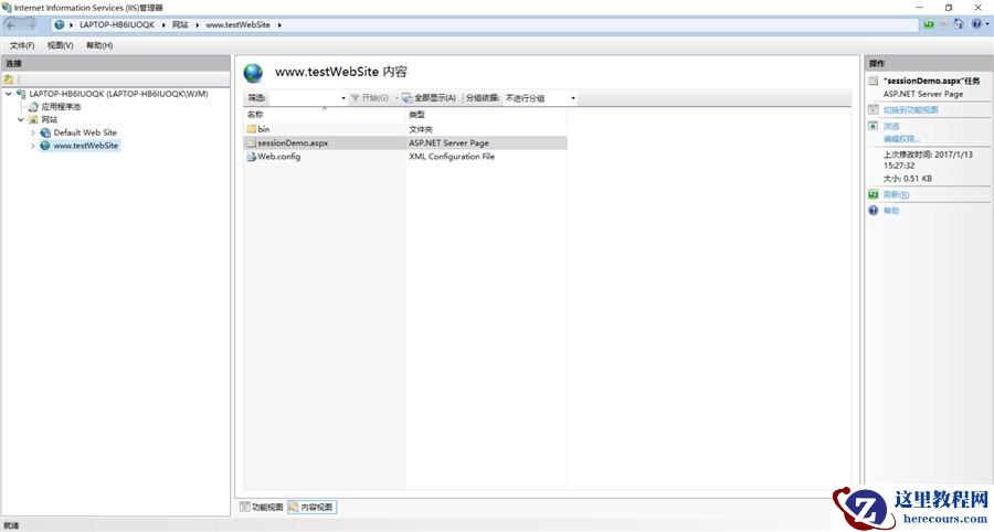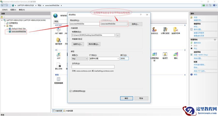 5、此时,IIS主界面,“网站”多了一个站点“www.testWebSite”,即是刚才给站点取得名字。