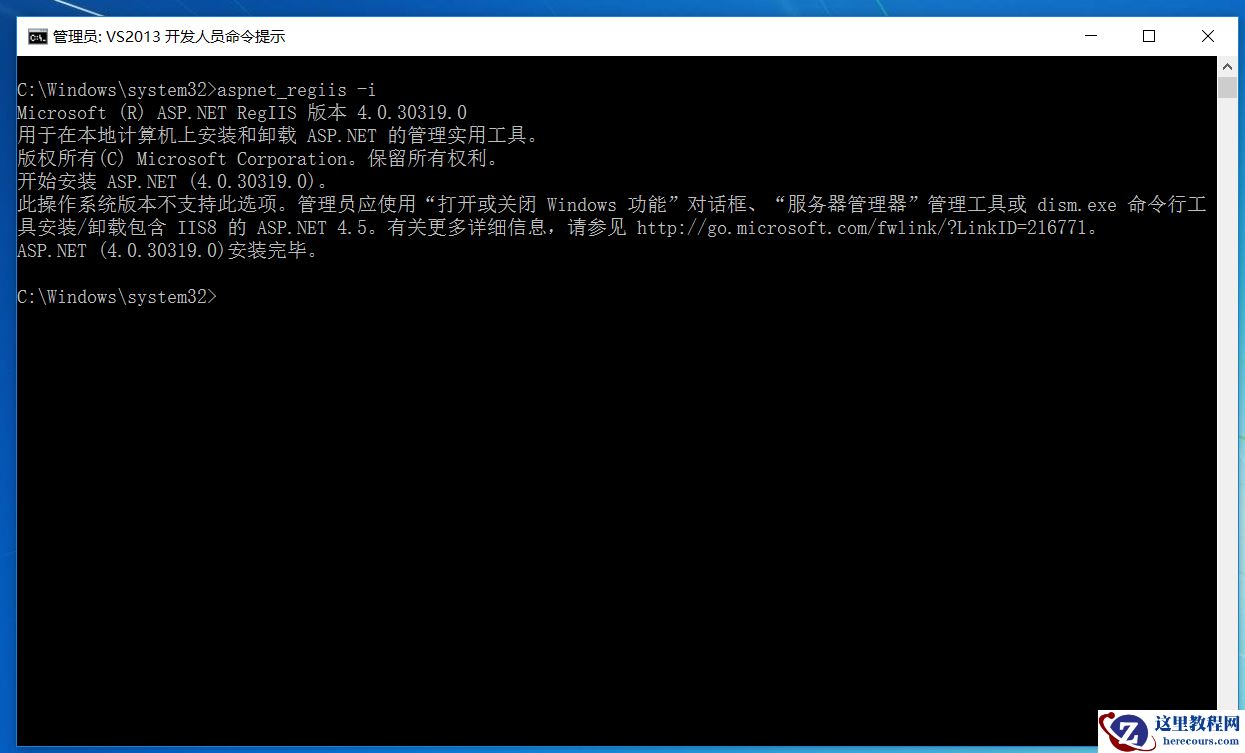 在所用程序中找到大写V,选择“Visual Studio 2013”—>选择“Visual Studio Tools”—>以管理员身份选择“VS2013 开发人员命令提示”,进入CMD。输入"aspnet_regiis -i"。