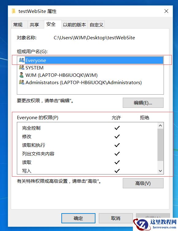 点击要VS已发布文件,右键—>属性—>安全—>编辑—>添加—>输入“everyone”—>为用户everyone赋权限—>确定。