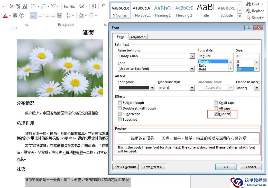 当操作Word文档时,我们可以通过Microsoft Word点击字体对话框来隐藏所选择的文本。请通过如下的屏幕截图来查看Microsoft是如何隐藏文本的:
