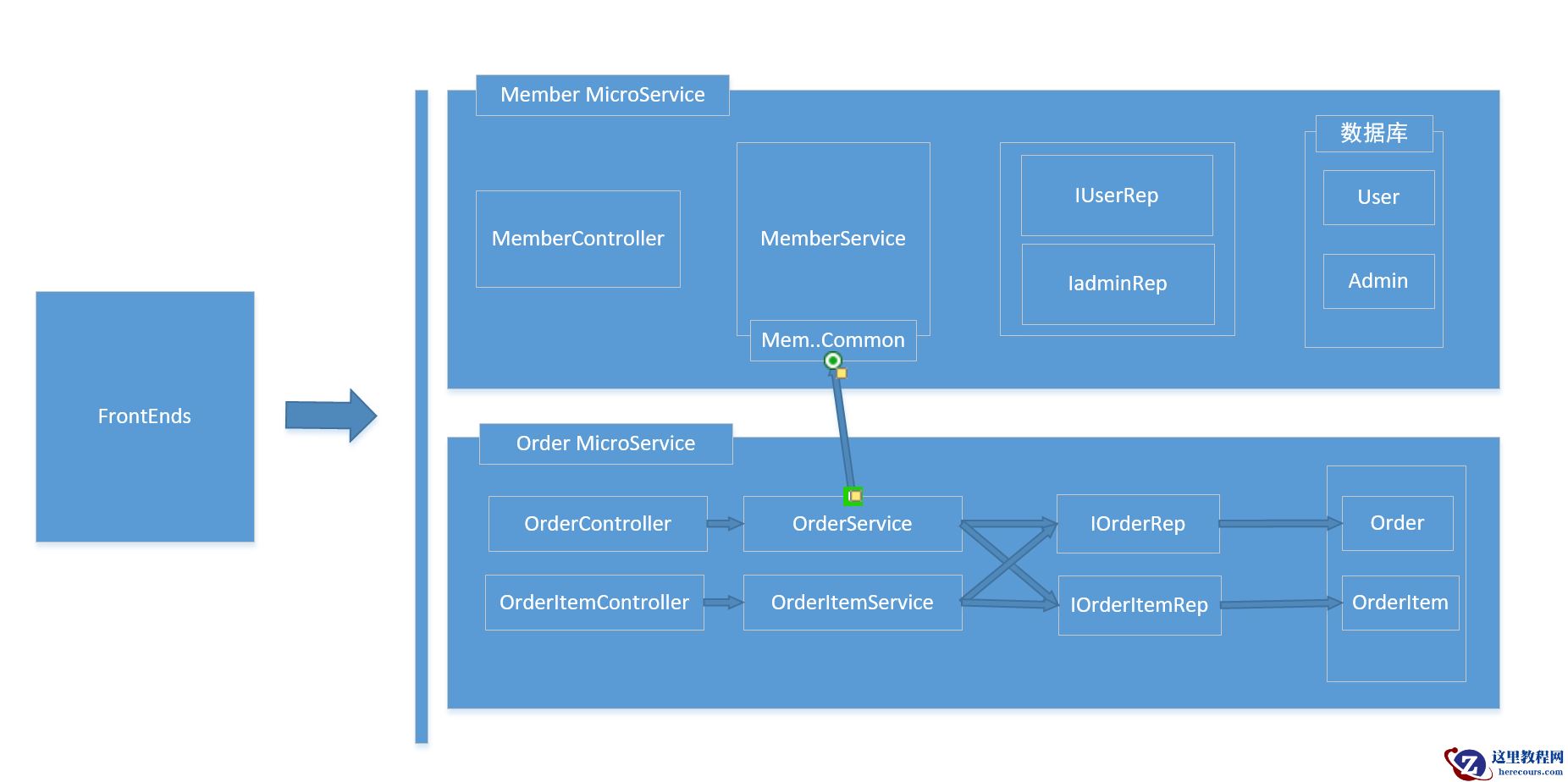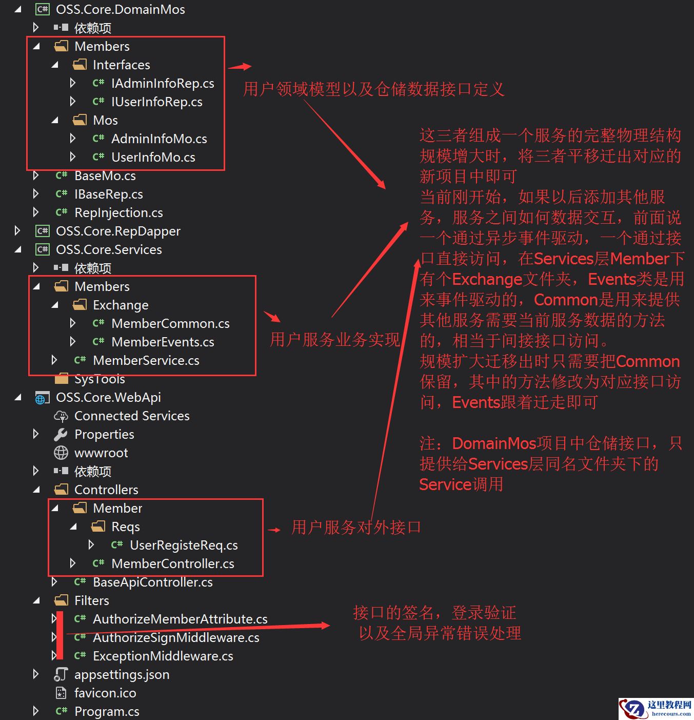 回到微服务的话题上,在这个产品中我不会为每个服务创建一套Layers下的类库实现,我将在这个项目通过文件夹隔离的形式来分开各个服务,你可以把WebApi当做一个API Gateway,内部的调用顺序我希望是这样的: