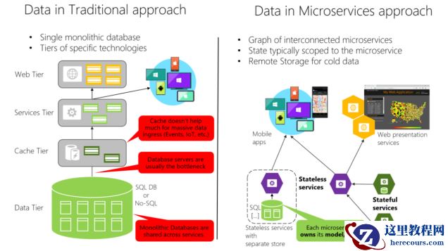 在传统的整体服务框架中,模块之间存在着很大的耦合,项目内部存在互相调用,以及各种复杂聚合操作,所以在多数情况下只能整体部署,在左侧图中我们可以看到负载均衡时我们需要整体部署在多台机器上,相对数据库也是如此,而一个项目中每个模块的需求是不一样的。