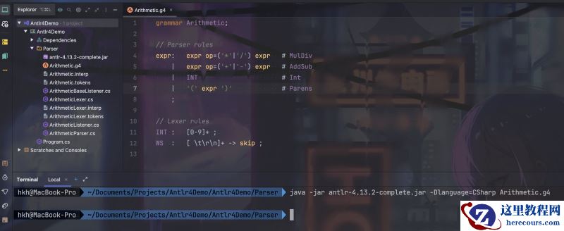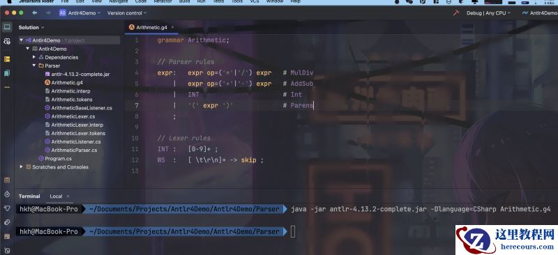 其中,Arithmetic.g4 是我们编写的语法规则文件,-Dlanguage=CSharp 表示生成 C# 语言的语法分析器。