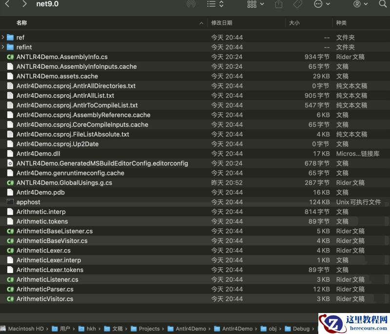 执行上面的命令后,会生成一些文件,其中包括 ArithmeticLexer.cs、ArithmeticParser.cs。
