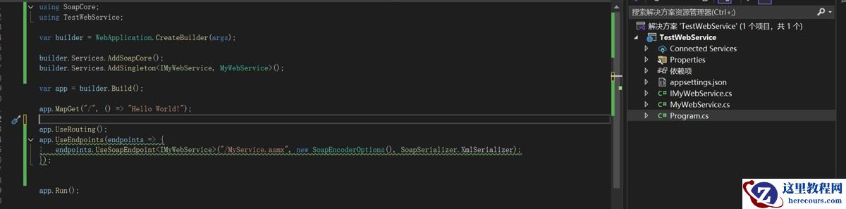 // 注册服务 builder.Services.AddSoapCore(); builder.Services.AddSingleton<IMyWebService, MyWebService>();