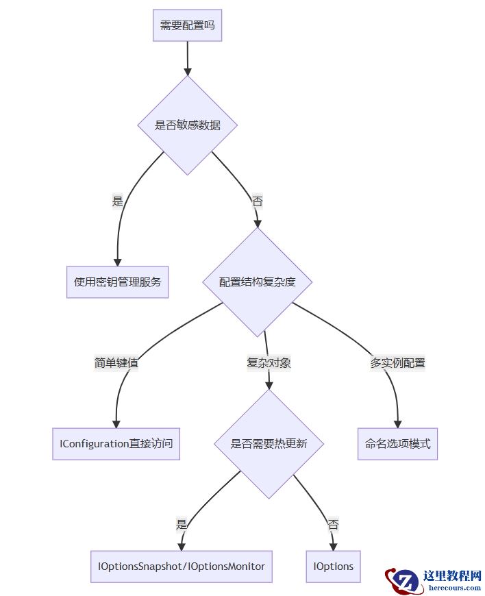 安全优先:敏感数据必须隔离存储(Key Vault/Secrets Manager)环境隔离:严格区分开发、测试、生产配置强类型导向:选项模式为主,避免魔法字符串变更可观测:实现配置变更审计和通知性能可控:关键服务使用配置冻结技术6.2 配置方案选型决策树