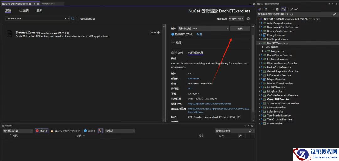 在 NuGet 包管理器中搜索 Docnet.Core 安装: