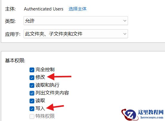 点击“选择主体”,找到 Authenticated Users 并添加。最起码给予写入和修改权限。