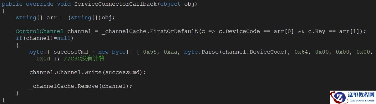 代理服务通过ServiceConnectorCallback和ServiceConnectorCallbackError函数接口接收设备驱动反馈的结果信息,如果中间出现异常会调用ServiceConnectorCallbackError,如果正常会调用ServiceConnectorCallback函数,ServiceConnectorCallback函数接口根据记录的命令与IO通道的对应关系,再把结果发送给控制端。ServiceConnectorCallback代码如下图: