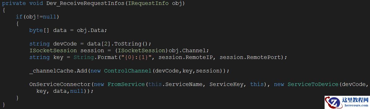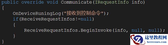 dev.ReceiveRequestInfos事件是控制驱动继承ServerSuperIO框架中RunDevice驱动类扩展的事件接口,ServerSuperIO单例模式接收到数据信息,如果符合协议标准会把数据信息反馈给驱动程序的Communicate接口,ReceiveRequestInfos事件把数据信息传递给代理服务订阅该事件的Dev_ReceiveRequestInfos函数。代码如下图: