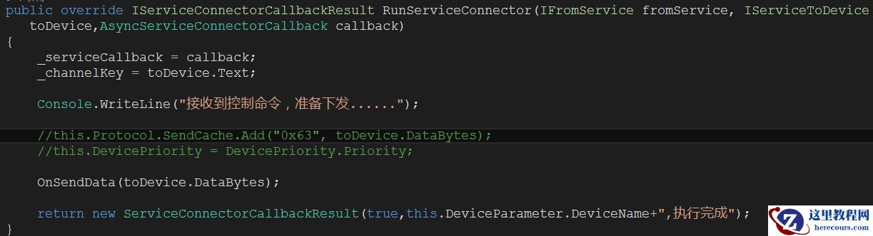 这个设备驱动与传感器相对应,之间相互过行数据交互。设备驱动的RunServiceConnector接口负责接收代理服务Dev_ReceiveRequestInfos(OnServiceConnector)函数传递过来的命令信息。代码如下图: