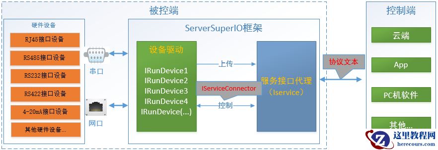 控制端发起控制命令,用ServerSuperIO服务接口开发一个简单的代理服务,通过服务连接器IServiceConnector接口与设备驱动进行交互,设备驱动接收到控制命令后下发给设备或传感器,等待控制返回的确认消息,再原路返回给控制端。