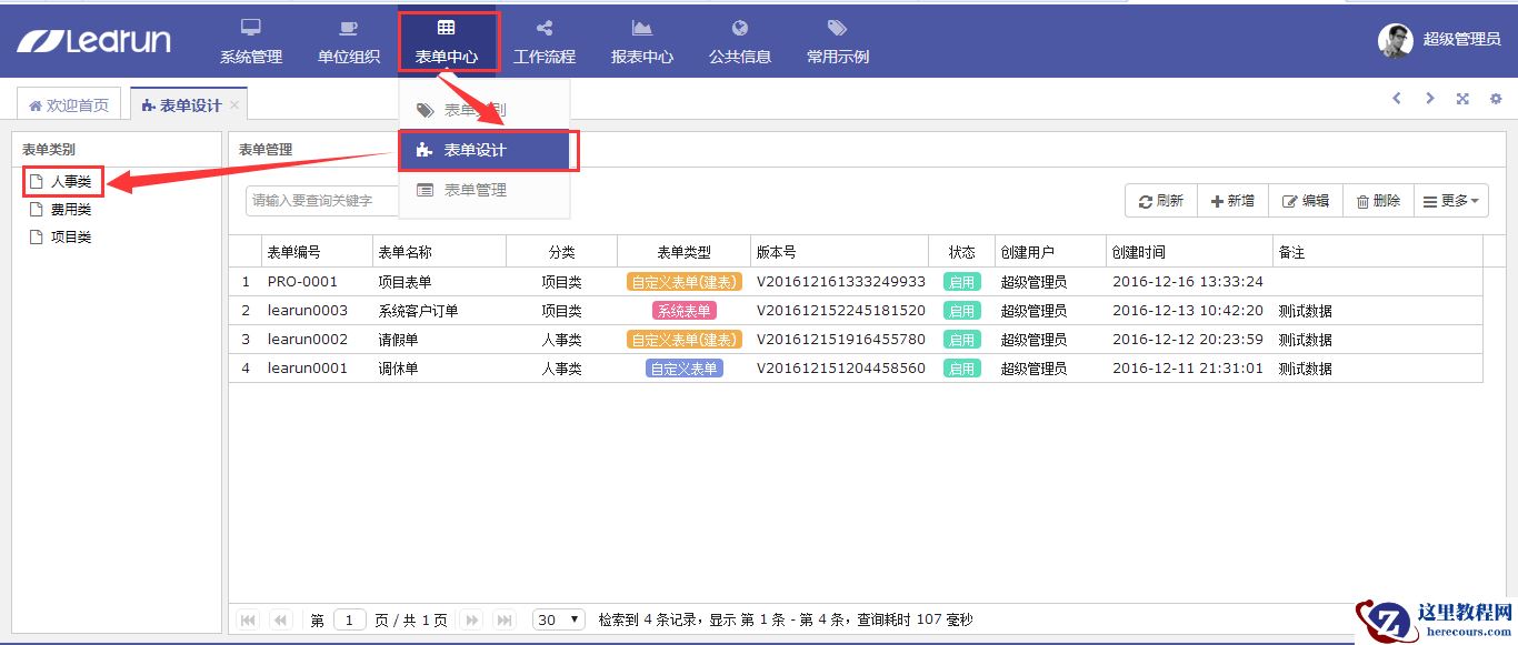 1.先设计一个请假单(用于流程中进行流转),点击表单中心—表单设计