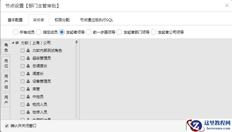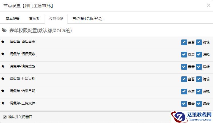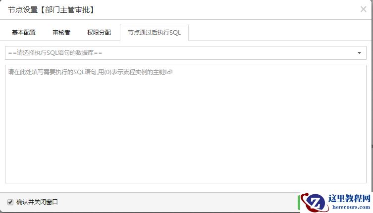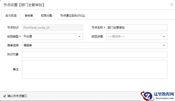 10.对流转经过的节点进行设置,包括基本配置、审核人员设置及审核人员的权限设定、SQL语句的设定(以部门主管审批节点为例,其他节点略过)