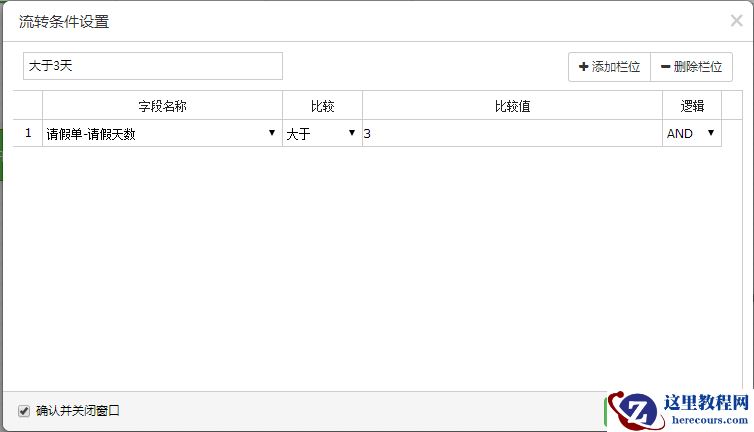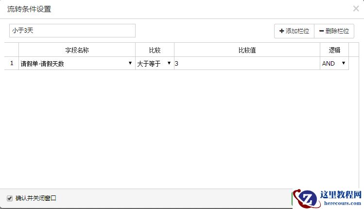 11.下面进行对流转条件的设置(字段会根据你选择的表单自动整合到下拉框中,条件可以设置多个)