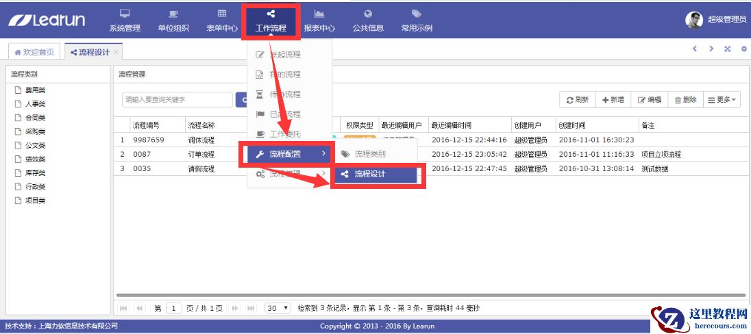 6.下面就是工作流的设计了,点击工作流程—流程管理—流程设计