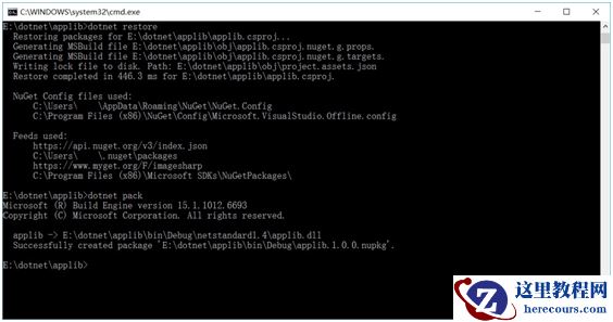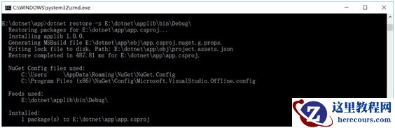 还原使用的命令是:dotnet restore -s E:\dotnet\applib\bin\Debug\,即dotnet restore -s包的路径。