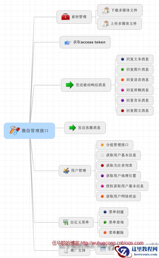 上面的消息分类是微信服务器向开发者服务器发送的消息请求操作,还有一种消息,是我们开发者服务器向微信服务器进行的消息请求或者响应,这种这里暂且称之为微信的管理接口,它表明了我们可以通过这些接口进行相关的消息回复或者数据管理操作。它的分类图如下所示。