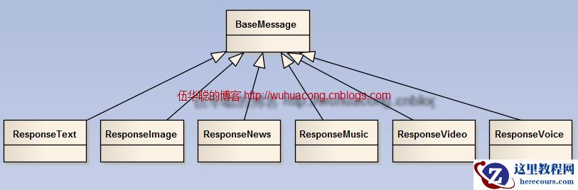 微信的回复消息处理,它也和上面小节的信息一样,它也是继承自BaseMessage实体类的(同样,下图的实体类及其继承关系也是自定义的,方便程序开发),它的关系如下所示