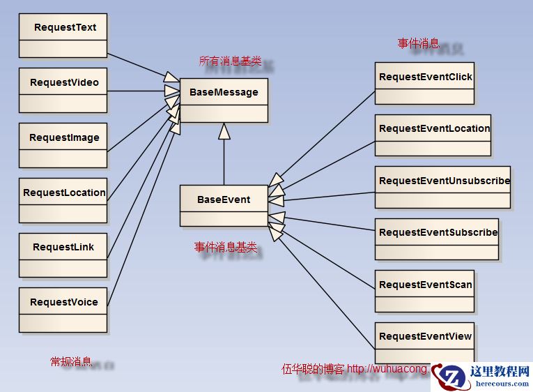 }从上面的代码可以看出,不同的消息,到处理函数这里,就以不同的消息实体类的方式传递过来了(注意:实体类是我根据程序开发需要自己定义的,非微信本身的实体类),这样非常方便我们处理操作,否则每次需要解析不同的消息内容,很容易出现问题,这样强类型的数据类型,提高了我们开发微信应用的强壮型和高效性。这些实体类的对象有一定的继承关系的,他们的继承关系如下所示。