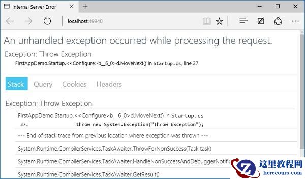 现在如果程序中出现异常,您将在页面中看到一些想要看到的异常信息。你也会得到一个堆栈跟踪:这里可以看到Startup.cs第37行有一个未处理的异常抛出。
