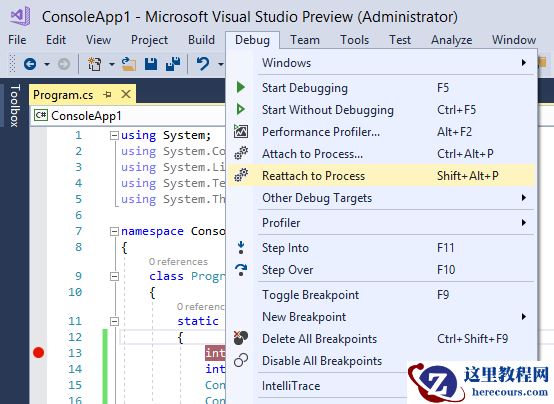 Attach to Process是大家经常需要用的功能,Visual Studio 2017中有一个新的选项叫做Reattach to Process,可以方便大家重新附加到最近一次附加到的进程上。