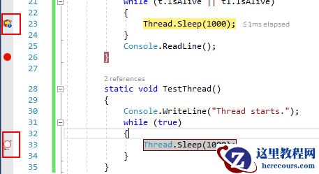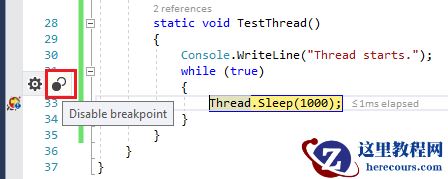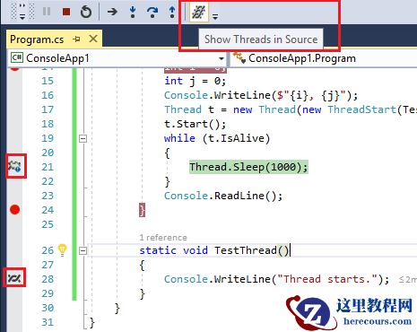 在调试过程中,调试工具栏中有一个新的选项叫做:Show Threads in Source。点击后即可在有线程停止的代码行前显示一个图标,鼠标停留在图标上显示线程,右击图标可以显示可用操作。