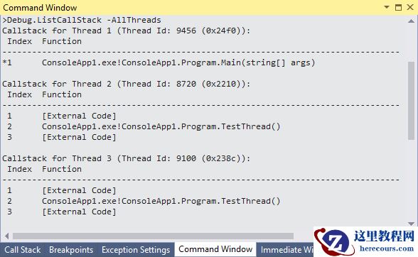调试过程中,在Command Window中输入”Debug.ListCallStack -AllThreads”,即可看到所有线程的调用栈。