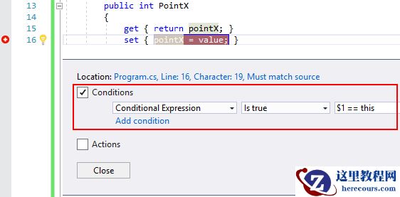 这时实例a被赋值到$1中,在要添加的断点出右击选择Conditions…