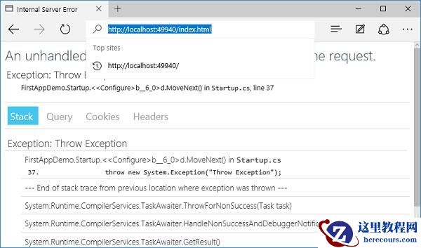 当您运行应用程序并在浏览器中输入index.html时,您将看到app.Run中间件将抛出一个异常,因为目前在我们的应用程序中什么都没有。