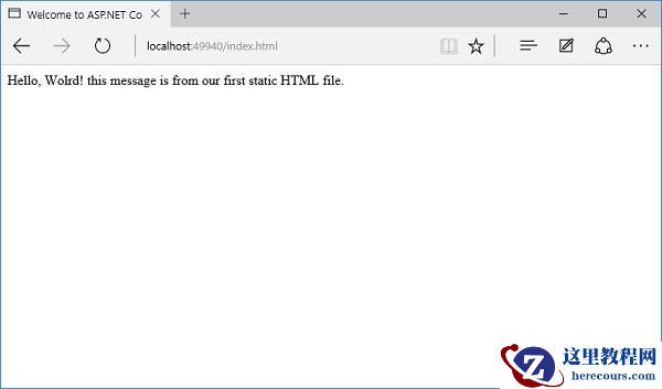 <!DOCTYPE html> <html> <head> <meta charset="utf-8" /> <title>Welcome to ASP.NET Core</title> </head> <body> Hello, Wolrd! this message is from our first static HTML file. </body> </html>