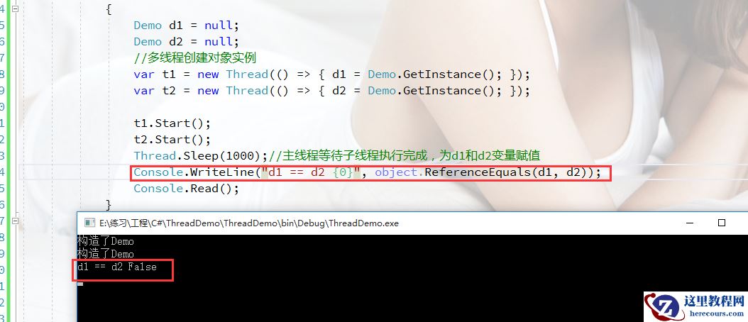 var t2 = new Thread(() => { d2 = Demo.GetInstance(); });