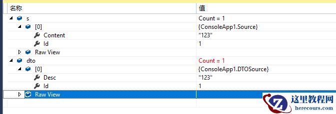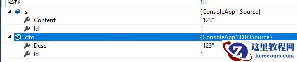 DTOSource dto = Mapper.Map<DTOSource>(s);第一步建立Source到DTOSource之间的映射,初始化一个Source实例后,来看下执行结果: